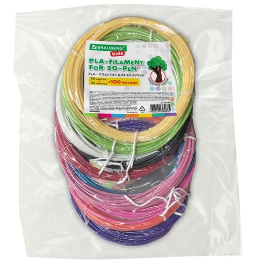 Безопасный PLA-пластик для 3D-ручки, 100 метров (10 цветов х 10 м), BRAUBERG KIDS