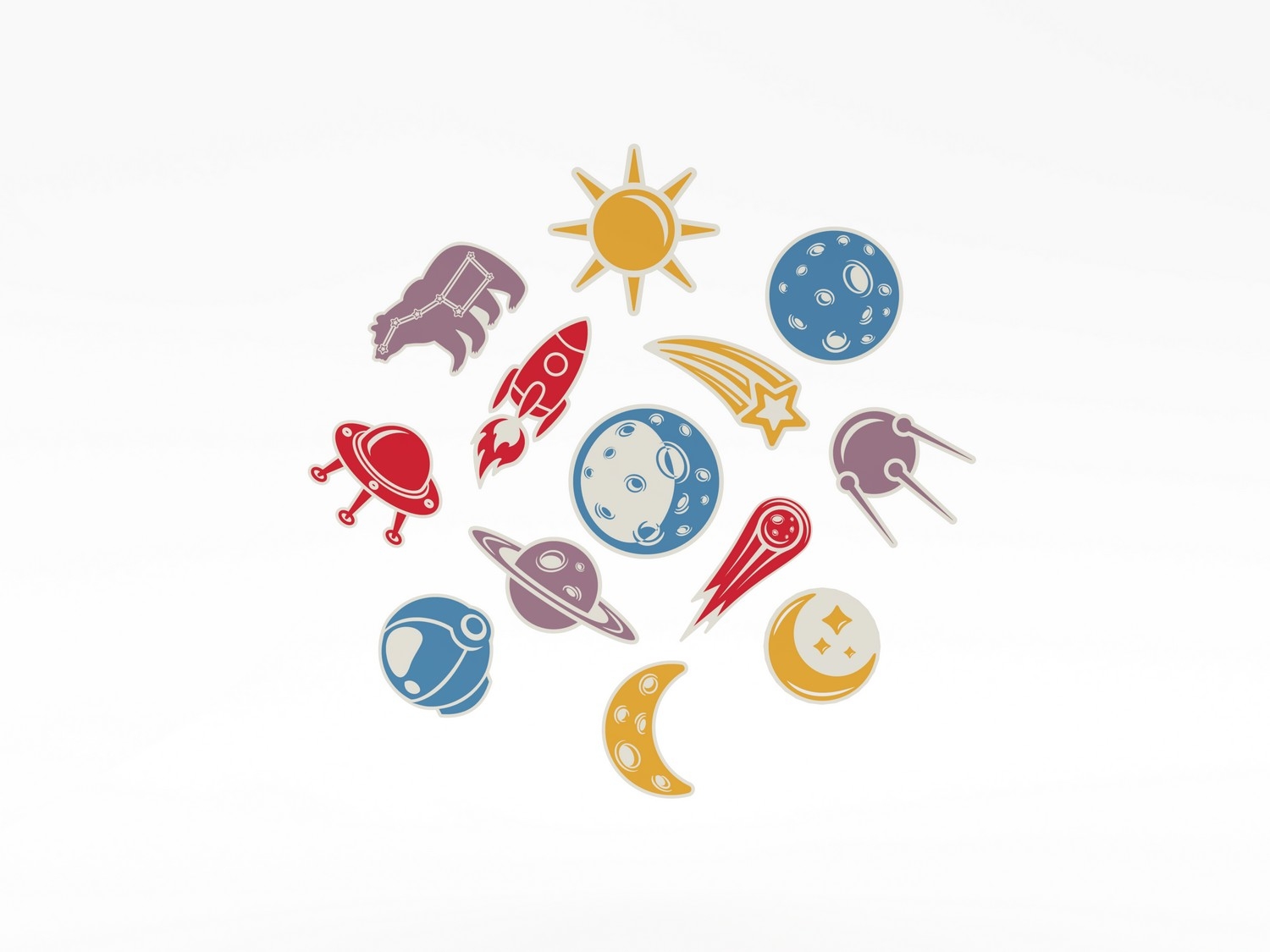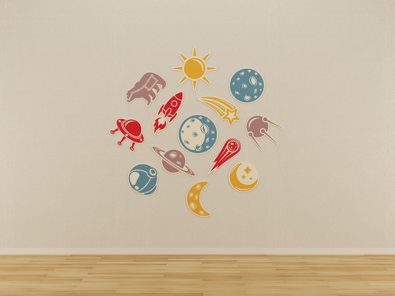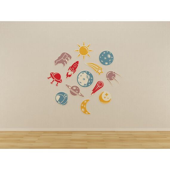 Набор декоративных панелей, выполненных в космический тематике. Подходит для оснащения детского сада, школы и другого образовательного учреждения для создания развивающей предметно-пространственной среды. Отличное интерьерное решение для оформления помещений в едином стиле.