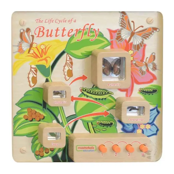 Панель из березовой фанеры 46 х 46 х 5,8 см, для изучения жизненного цикла бабочек, содержит настоящие образцы, в прозрачных акриловых блоках, которые позволяют детям подробно изучить каждый из 4 этапов ( яйцо, гусеница, куколка и взрослая бабочка), можно рассмотреть каждый из них по очереди благодаря отдельному освещению.