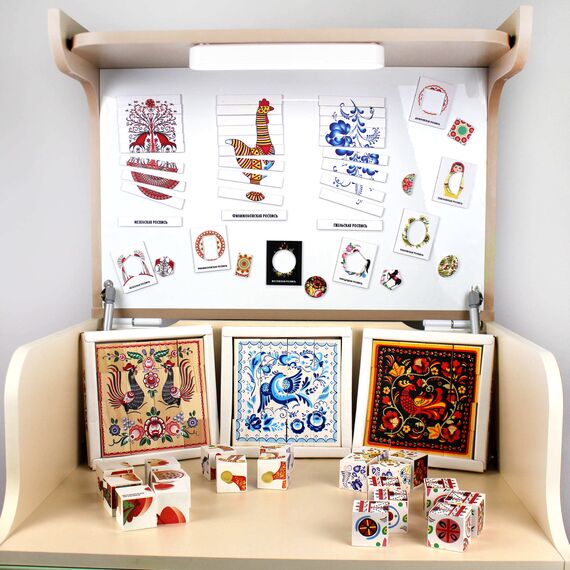 Развивающие игры: Пазл «Русские узоры: Хохлома»; Пазл «Русские узоры: Гжель»; Пазл «Русские узоры: Городецкая роспись»; Набор деревянных кубиков «Русская народная игрушка. Промыслы». Серия Патриотическое воспитание.; Набор деревянных кубиков «Русская народная роспись». Серия Патриотическое воспитание.; Магнитные вкладыши «Волшебные узоры»; Магнитные пазлы «Волшебные узоры».