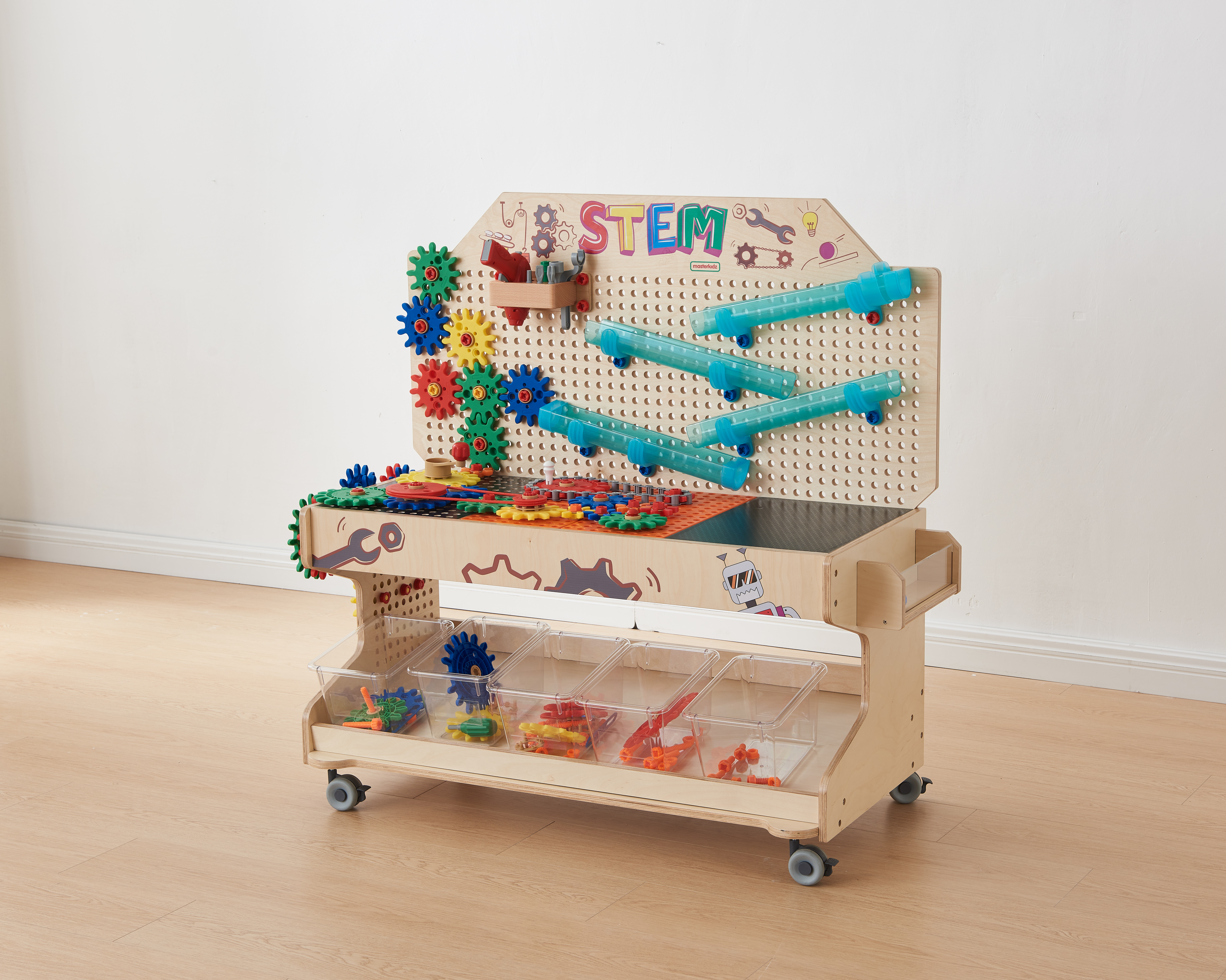 • В комплекте идут вертикальная STEM-панель и настольная горизонтальная STEM-панель, которые дают возможность установки развивающих пособий Masterkidz, таких как винты, шестеренки, треки и т.д.