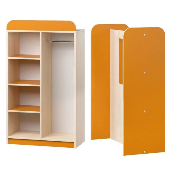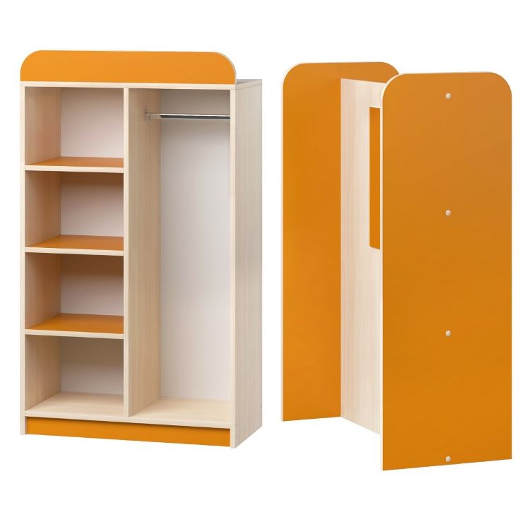 На боковых закругленных полках можно разложить различные аксессуары и украшения, верхняя полка в центральной секции предназначена для головных уборов, а на нижней достаточно места для обуви. Уголок устойчив, не имеет острых углов и может быть поставлен в любом месте группы или детской комнаты.