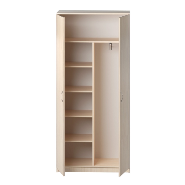 Шкаф для одежды комби 854*398*1835 Шкаф изготовлена из ЛДСП 16 мм, все детали обработаны кромкой ПВХ 2 мм. Шкаф имеет три горизонтально разделенных отдела, с полками для одежды, головных уборов и принадлежностей, а также выкатную штангу для одежды. Задняя стенка ДВП. Вся продукция сертифицирована.
