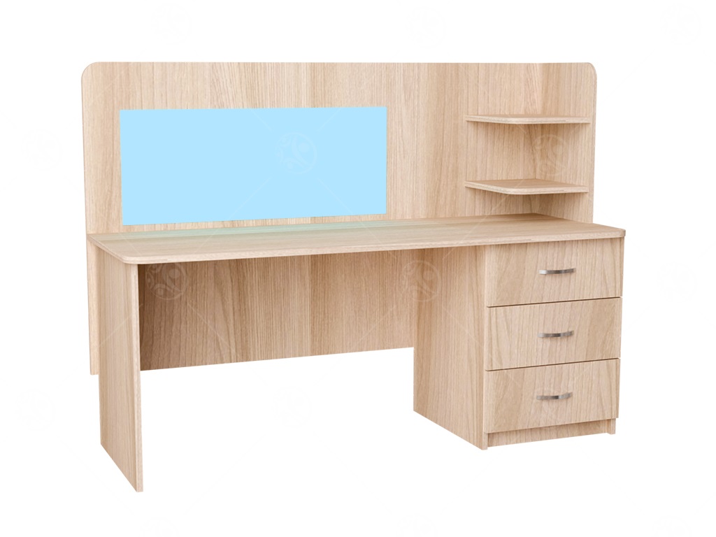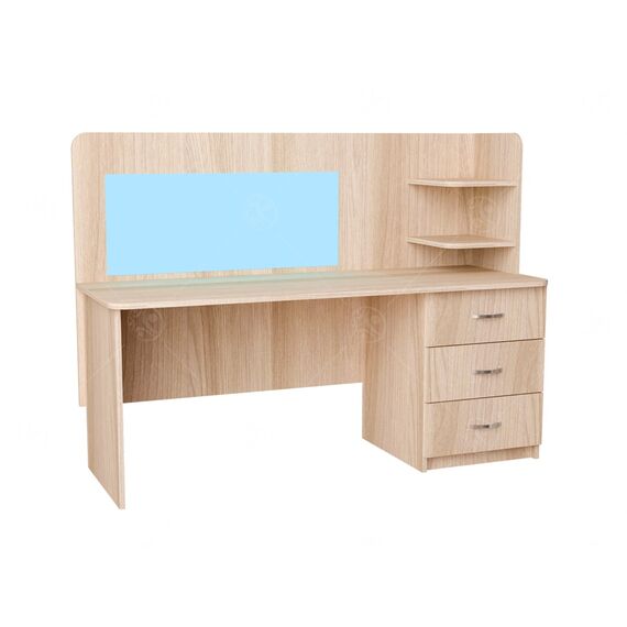 Стол для логопеда оснащен большим безопасным зеркалом, полочками для хранения необходимых пособий и выдвижными вместительными ящиками.