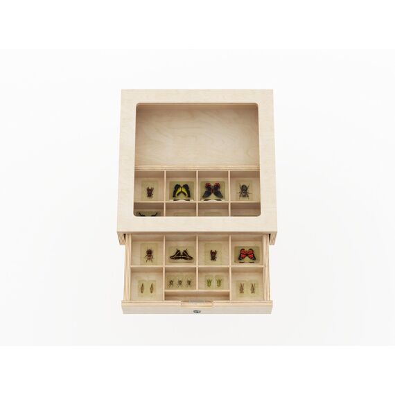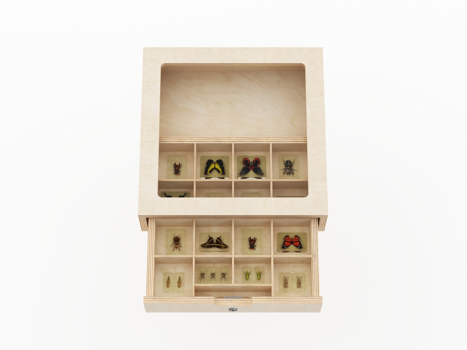 - Акриловая вставка предоставляет идеальный обзор на объекты. Она позволяет детям изучать экспонаты, гарантируя их полную сохранность.