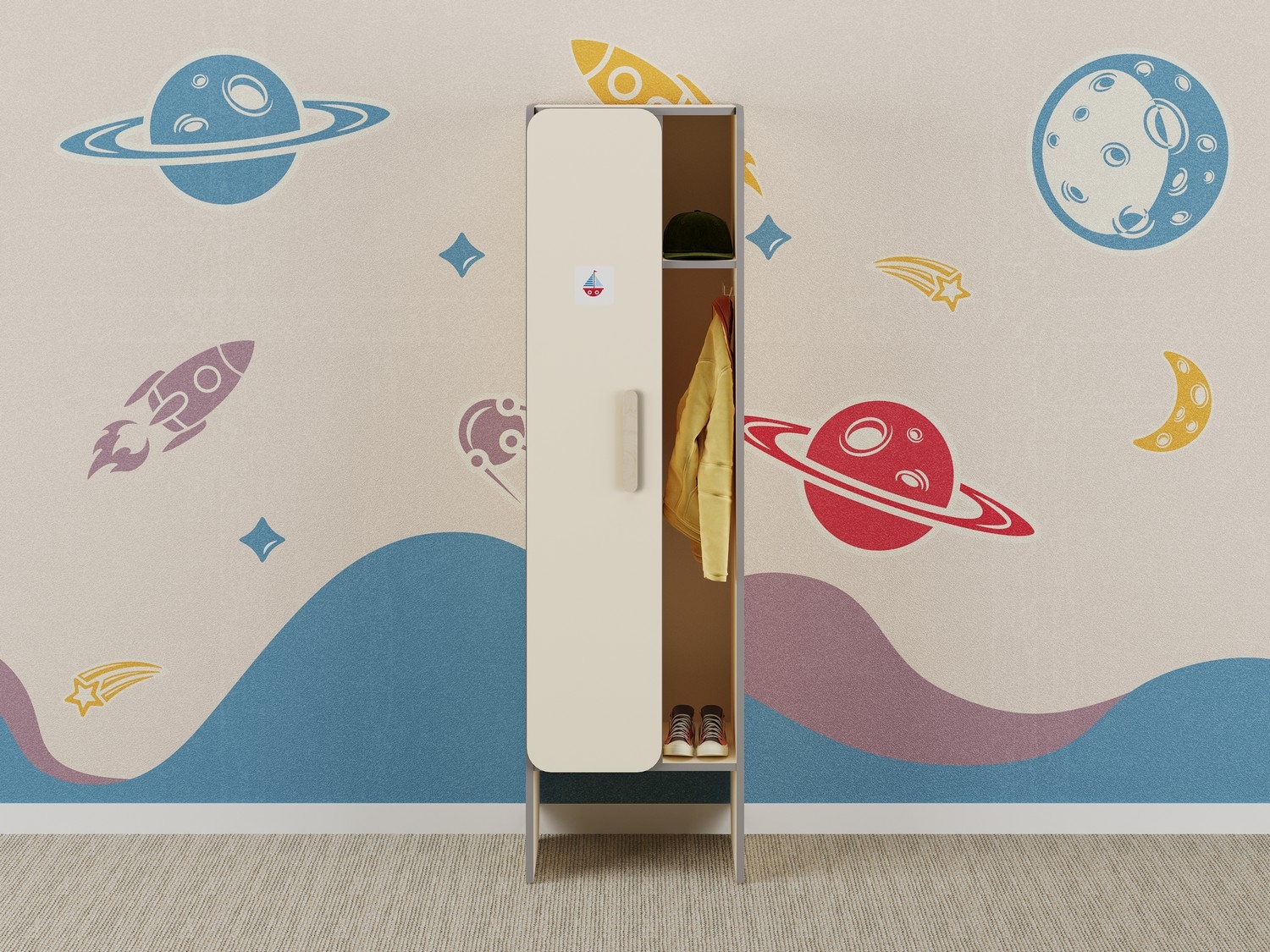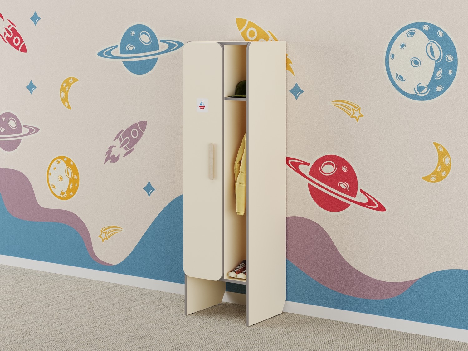 Детский шкафчик во входную группу предназначен для хранения личных вещей и игрушек. Конструкция разделена на две функциональные зоны: открытую — для верхней одежды, которую удобно просушить после прогулки, и закрытую — для сменной одежды и обуви. В нижней части шкафа предусмотрена выдвижная скамейка. Мебель разработана с учетом потребностей детей и сезонных условий эксплуатации, гарантируя удобство и практичность.