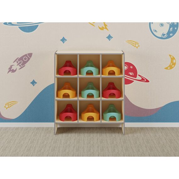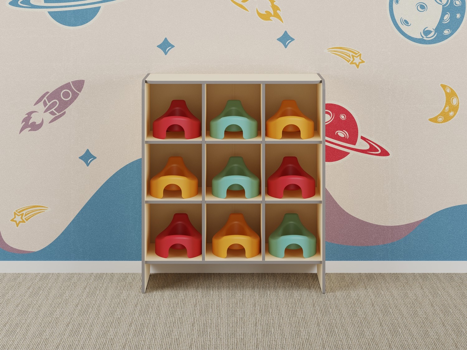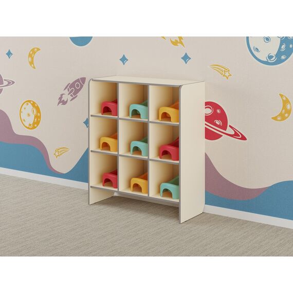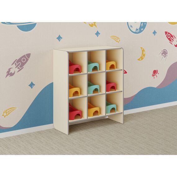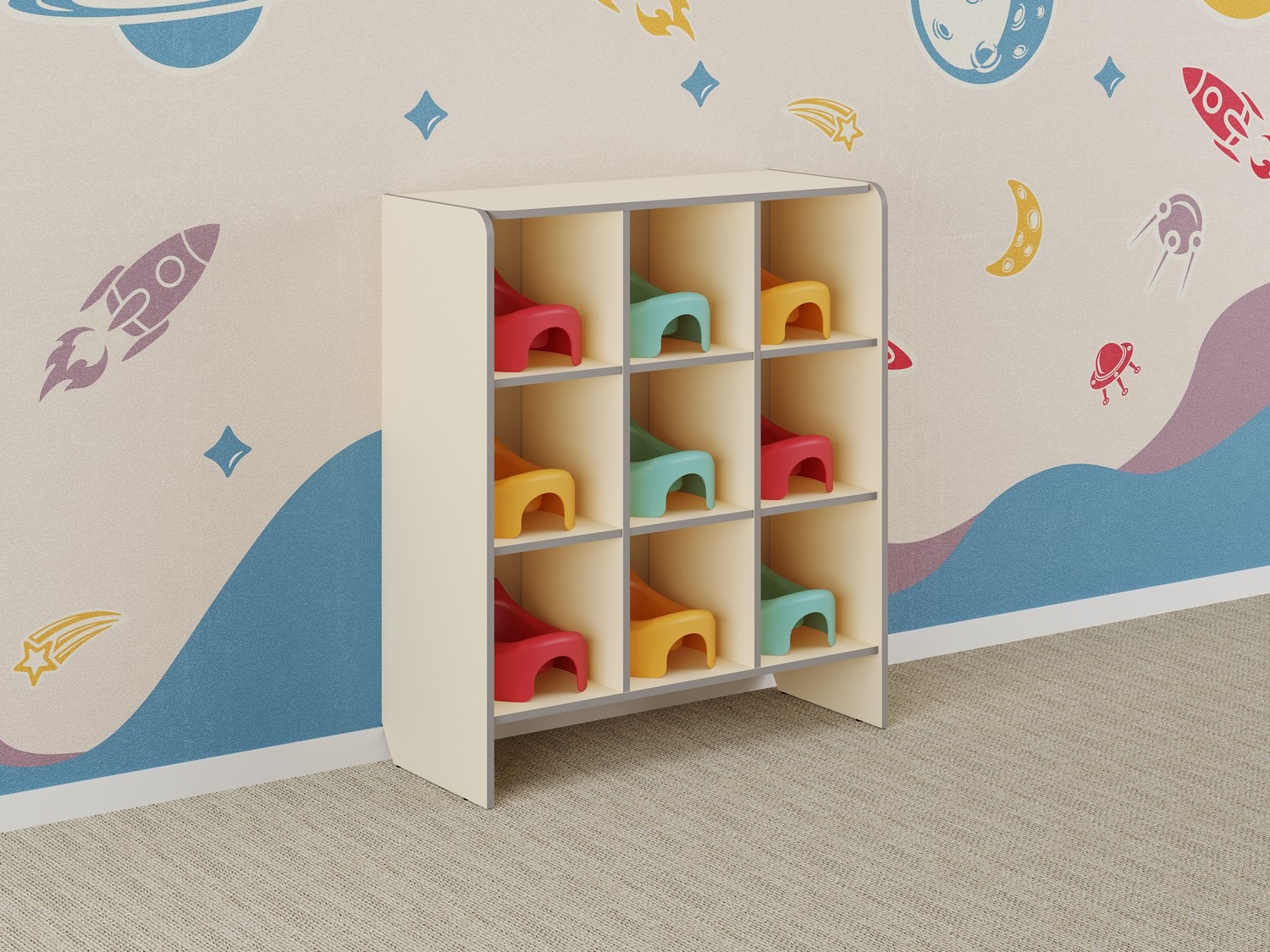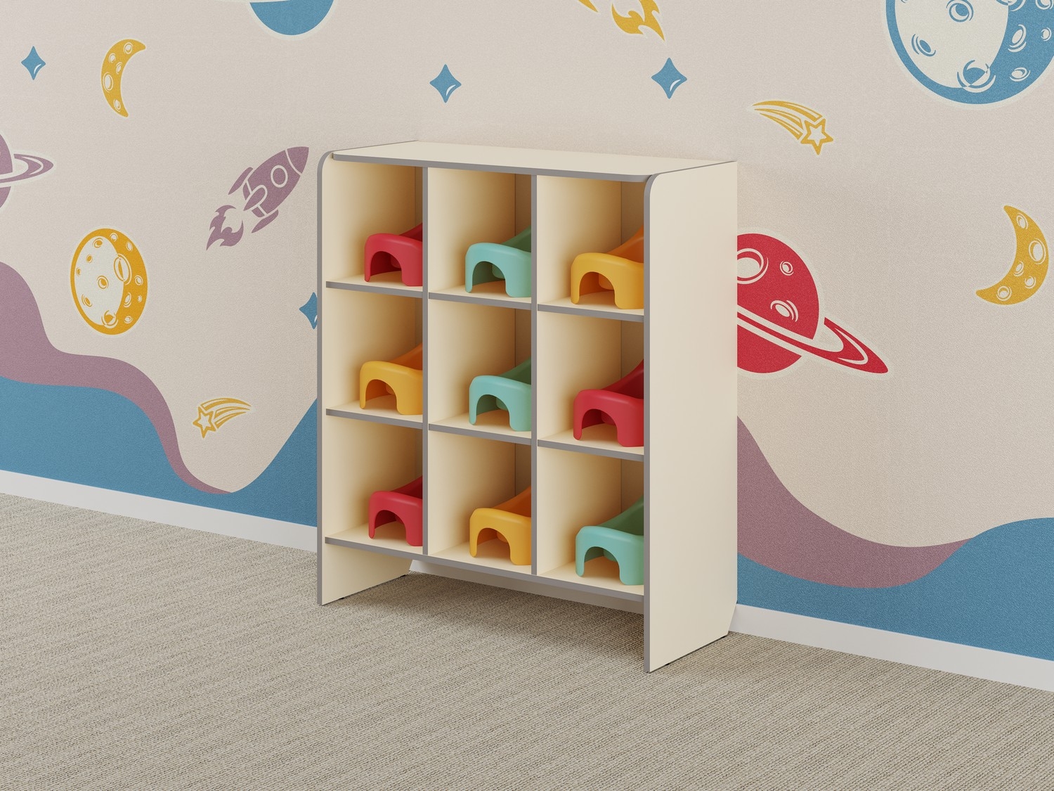 Функциональное решение для организации пространства в группах детского сада. Стеллаж помогает поддерживать порядок и чистоту, делая процесс воспитания малышей более удобным и организованным. Размеры стеллажа идеально подходят для размещения в уголке группы, обеспечивая доступность и удобство использования для самых маленьких. Конструкция состоит из 9 секций, каждая из которых рассчитана на один горшок.