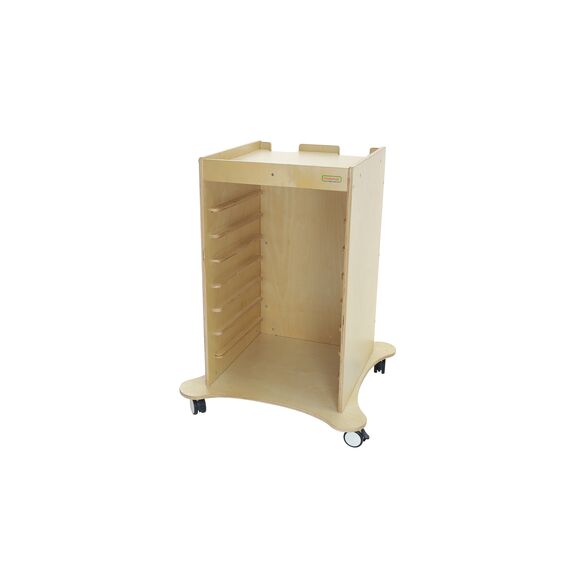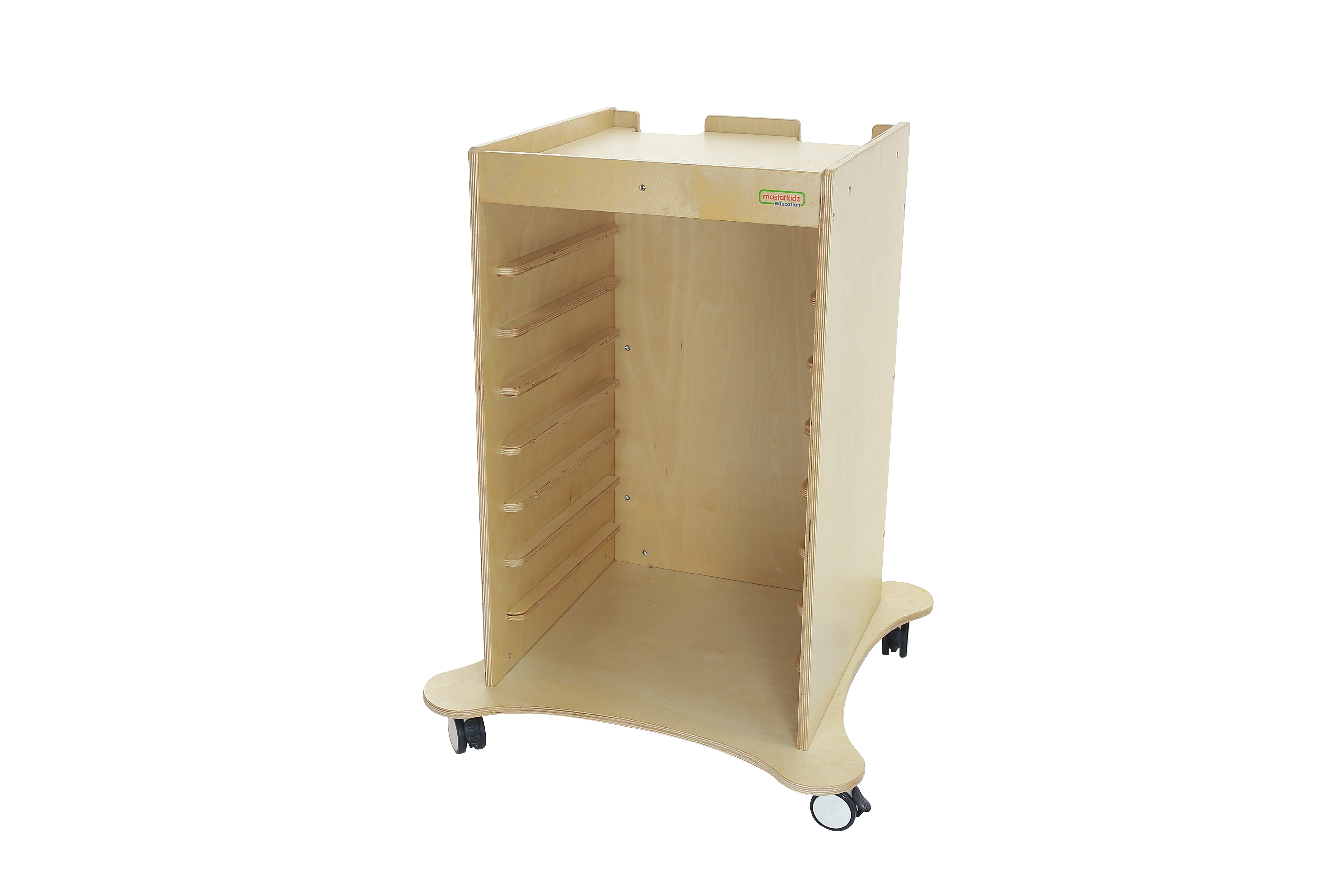 Передвижной стеллаж, выполненный из березовой фанеры. Предназначен для хранения 9 игровых панелей Masterkidz размером 46 х 46 см. Для удобного перемещения в нижней части стеллажа имеется основание с колесами, которые имеют систему стопора для фиксации на поверхности. Поставляется в разобранном виде с простой инструкцией по сборке и набором для монтажа.