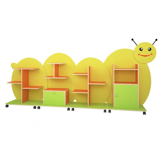 Стеллаж "Гусеница ". Продукция имеет надлежащие сертификаты качества.Удобная и вместительная модель с большими выкатными ящиками, открытыми полками , куда Вы можете поставить игрушки, книги, демонстрационный материал и другие пособия для занятий. А оригинальное оформление стенки поможет создать в игровой комнате яркую, красочную и интересную обстановку.