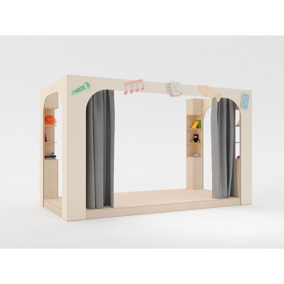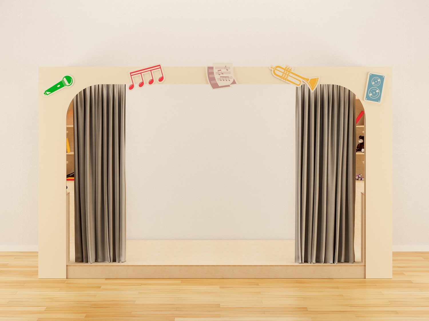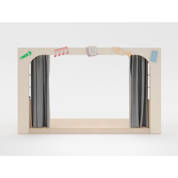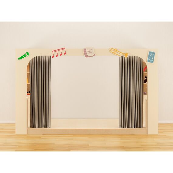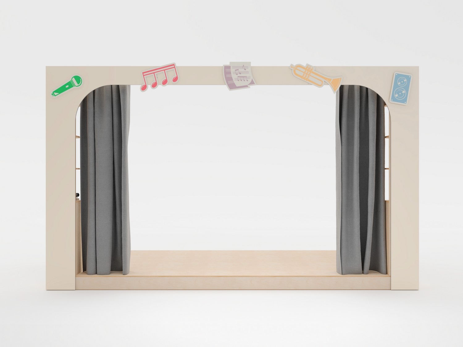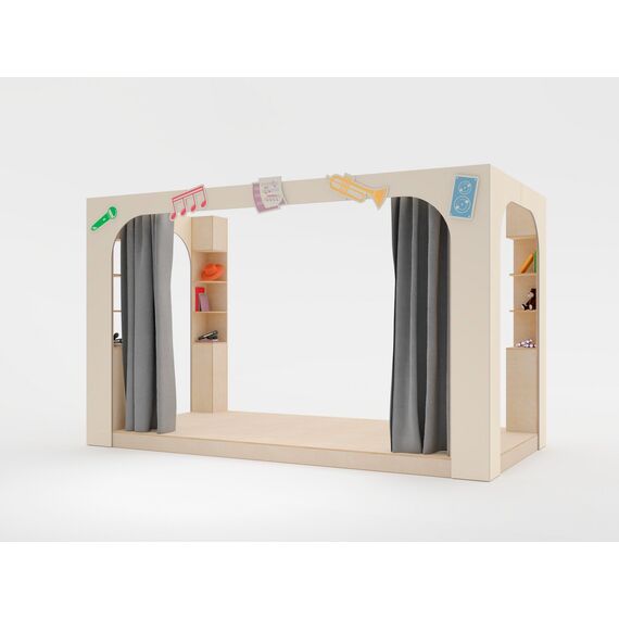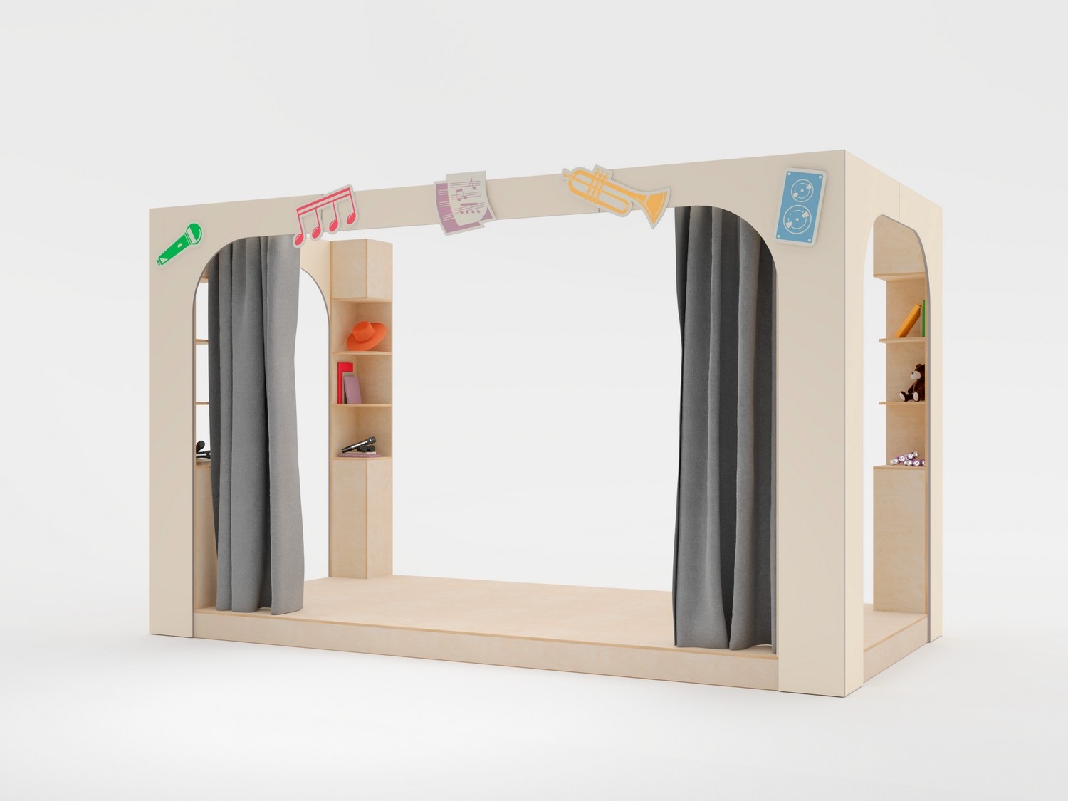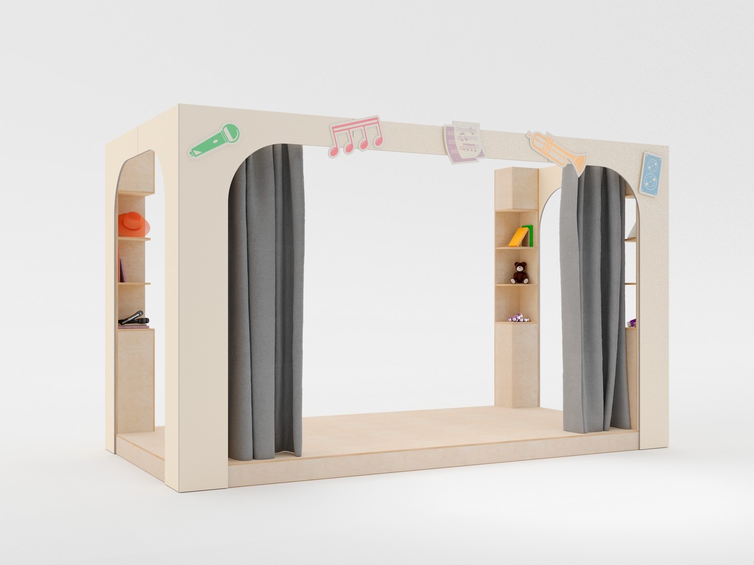 На передней арочной части сцены находится занавес. По четырем углам расположены полочки для хранения реквизита.