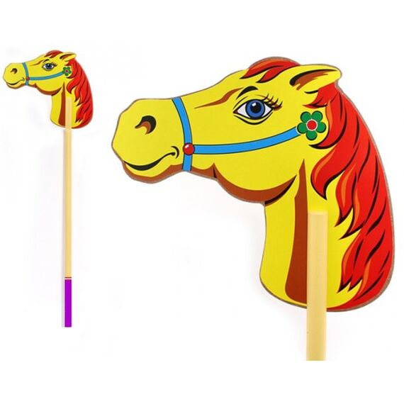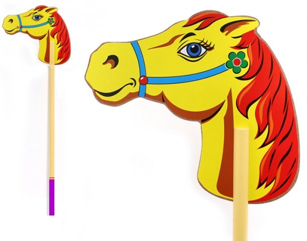 Конь-скакалка сделан: отшлифованная палка из дерева(берёза) покрыта краской ВД. Голова из МДФ 3мм, на которую наклеена картинка , покрытая спец. лаком, чтобы не стерлась типографская краска. Высота головы =23см, ширина по самой широкой части 24 см. Общий размер с палкой = 85 см, голова прибита к палке шпильками( гвоздями финишными). Заусениц нет.