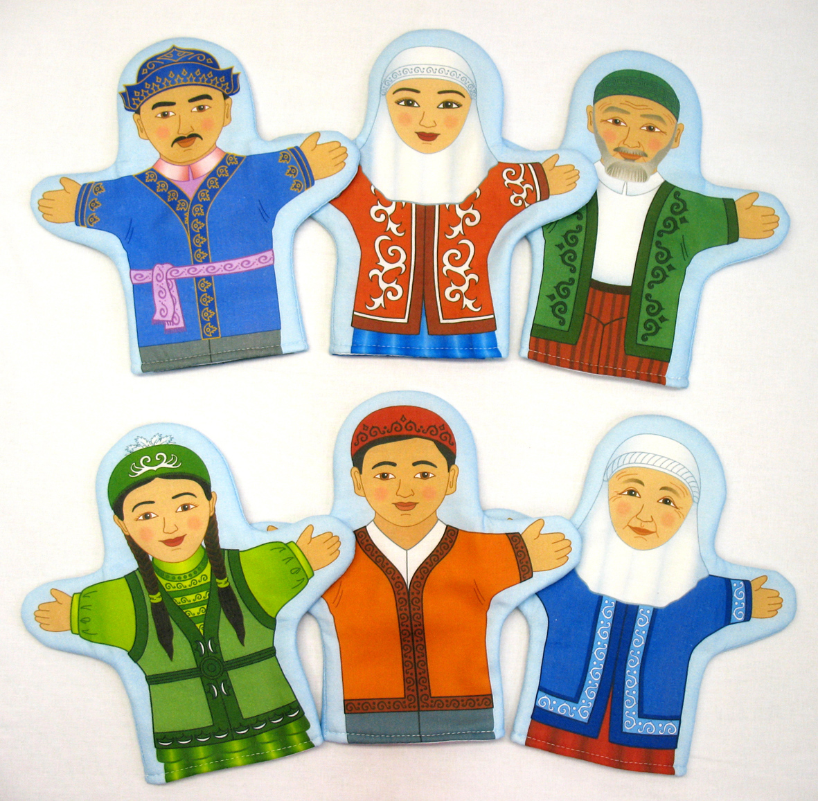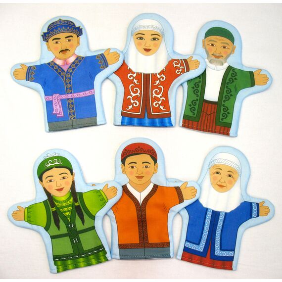 Набор наручных кукол представляет собой рукавички с изображенными членами казахской семьи в национальных костюмах: дедушка, бабушка, папа, мама, мальчик, девочка. Данные игрушки помогут узнать историю, особенности, культуру и быт народа Казахстана. Могут использоваться на тематических занятиях в детских садах и начальной школе.