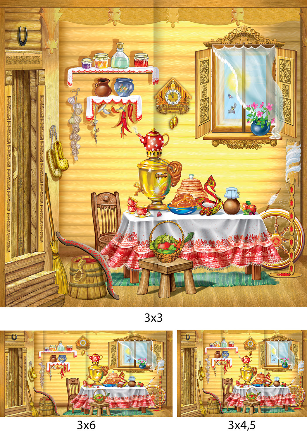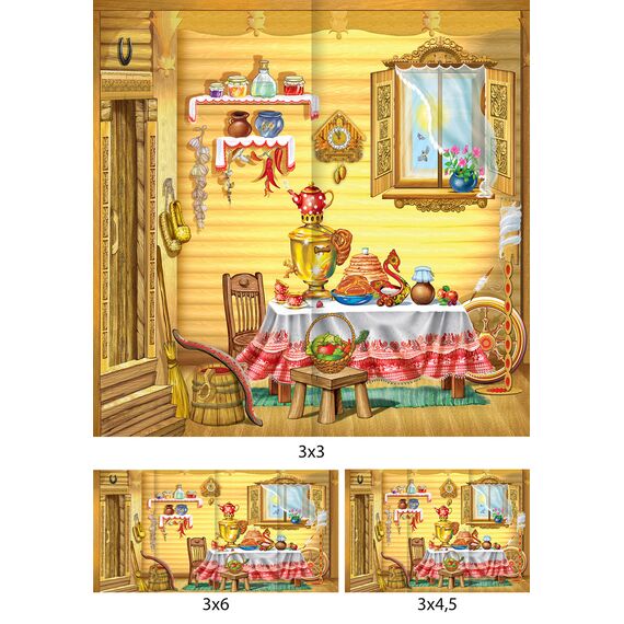 Русская изба - Декорация / Занавес сцены — швейное изделие, состоящее из отдельно обработанных полотнищ с печатным рисунком. Изделие предназначено для оформления помещений. Полотнища скреплены между собой по верхнему срезу внахлест и свободно расходятся между собой по всей длине. Для изготовления занавеса сцены используется прочный и износостойкий материал габардин — не растягивается, не деформируется после стирки, способен хорошо сохранять форму, 100% полиэстер с поверхностной плотностью 180-190 г/м². Ширина готовых декораций в собранном (скрепленном) состоянии: 3 метра; 4,5 метров; 6 метров; либо по меркам заказчика. Количество полотнищ зависит от ширины декорации может составлять: 2 полотна; 3 полотна; 4 полотна; другое количество, исходя из индивидуального размера по меркам заказчика. Высота готовых декораций: 2,8 метра; 3 метра; либо по меркам заказчика. Нанесение рисунка выполняется на японском оборудовании с профессионально настроенными цветовыми профилями, позволяющими точно передать цвета и четкость рисунка. Ткань с таким рисунком сохраняет яркость, не линяет и не выгорает дольше обычных материалов. Боковые срезы полотнищ задника, обрабатываются швом в подгибку с закрытым срезом. Швы выполняются на прямострочной швейной машине с применением специализированного приспособления для двойной подгибки края ткани, ширина подгиба 0,6 см. Верхний срез обработан швом с закрытым срезом с притачанным креплением. Клиенту на выбор предоставляется четыре вида креплений: - шторная лента шириной 4 см.; - контактная лента «Велкро» шириной 5 см. белого цвета; - петли из репсовой ленты, пришитые последовательно, шириной 1,5-3 см.; - без креплений. Полотнища скрепляются по верхнему срезу внахлест, последовательно, с соблюдением состыковки нанесенного рисунка. Нахлест полотнищ – 7 см. Крепление осуществляется за счет контактной ленты-липучки «Велкро». Нижний срез обработан с закрытым срезом с двойным равнозначным загибом ткани (5см+5 см). Оплата креплений рассчитывается менеджером на основе вашего выбора. Стоимость креплений не входит в стоимость квадратного метра занавеса (в среднем эта сумма составляет ⁓10% от стоимости занавеса). Размер задника может отличаться на 3-5% - это стандартная величина усадки при термообработке ткани. Набор для рукоделия включает в себя все необходимые материалы для самостоятельного изготовления изделия: инструкцию по пошиву, ткань с нанесенными деталями кроя, ленту-липучку для соединения полотен между собой.