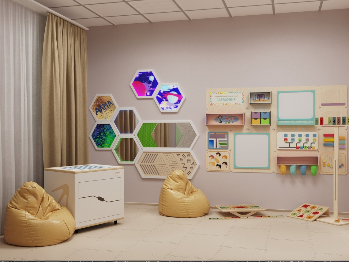 Это комплексное предложение позволит вам оборудовать «под ключ» кабинет психолога в ДОУ. Новинки и уникальные разработки от компании «АЛМА» сочетаются с классическими инструментами работы психолога-дефектолога. Готовый комплект содержит: стол психолога-дефектолога, рабочий стол для детей, компьютер специалиста с программным обеспечением для психологов «Профиль психолога АЛМА», интерактивную сенсорную панель с набором общеразвивающих программ для дошкольников, дидактическую панель «Гармония», кресла-мешки, набор корпусной мебели, нейротренажеры, методические материалы, обучающие пособия и многое другое.