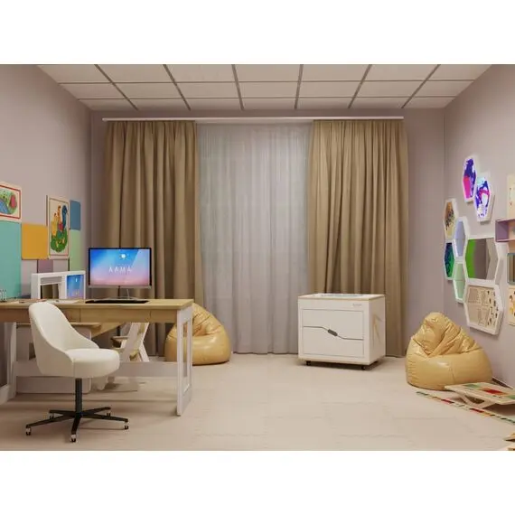 - Наглядность и визуализация. При заказе комплексного оснащения кабинета психолога в компании «АЛМА» вы можете получить собственный проект расстановки мебели, исходя из размеров вашего будущего помещения. Наши дизайнеры помогут вам учесть габариты оборудования для его удобного и эффективного использования.