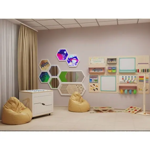 - Единый дизайн и эстетичность. В кабинете психолога важное значение играет комфортная располагающая среда, в которой ребёнок сможет раскрыться и довериться специалисту. Наше комплексное предложение решает эту задачу, ведь вся мебель, дидактические пособия и настенные панели имеют нейтральную, приятную глазу цветовую гамму, хорошо сочетаются между собой и создают дружелюбную атмосферу.