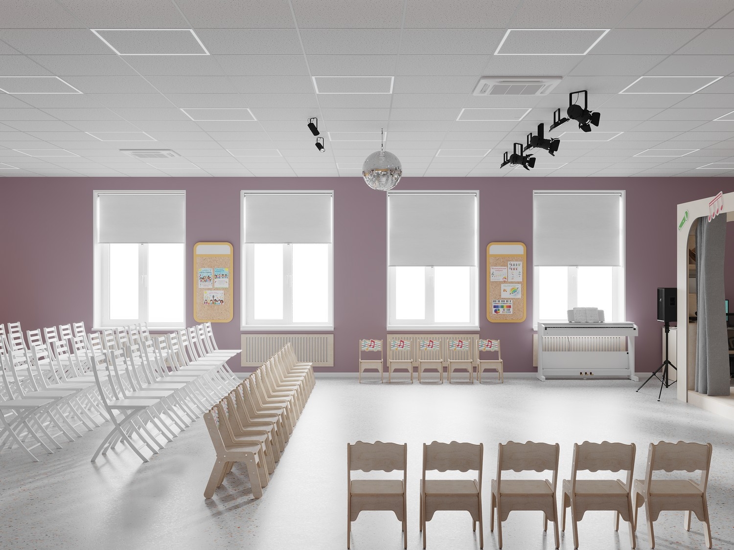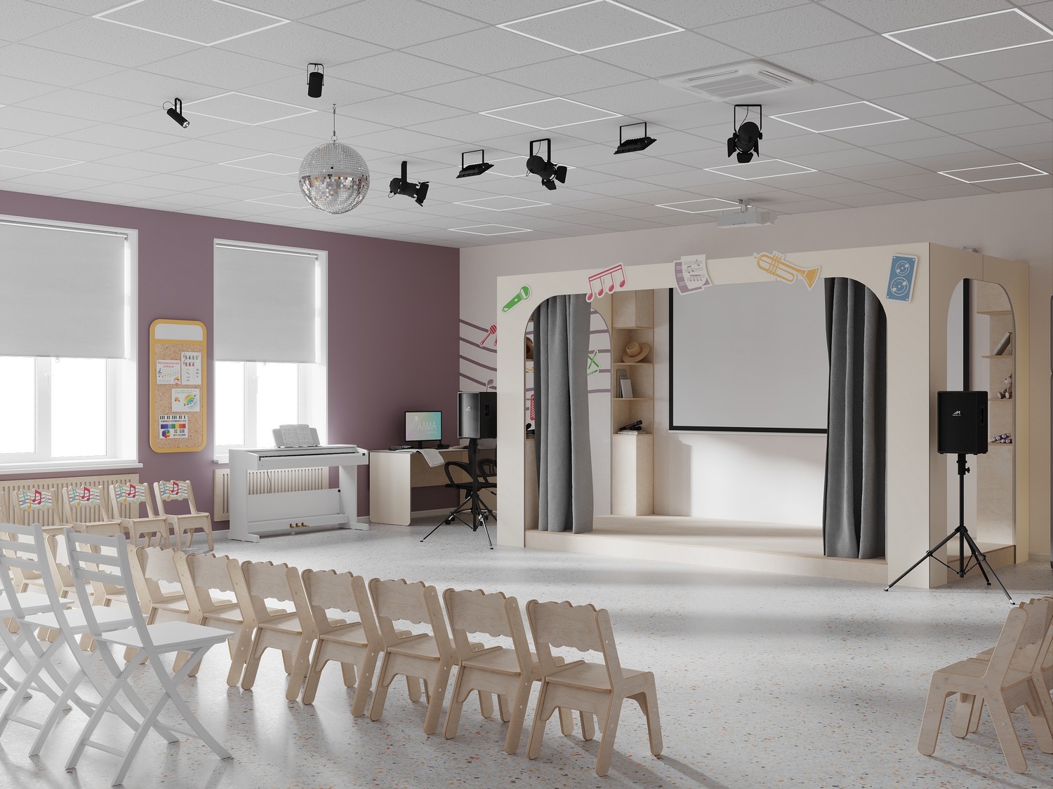 В комплектации готового музыкального зала есть техническое оснащение и базовый набор аксессуаров, костюмов и декораций для проведения тематических праздников и утренников. В зрительной части зала удобно размещается 25 воспитанников и 50 взрослых.