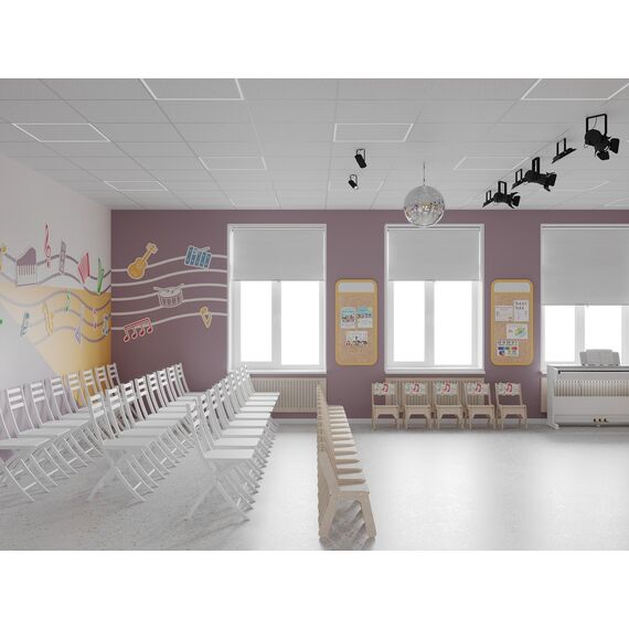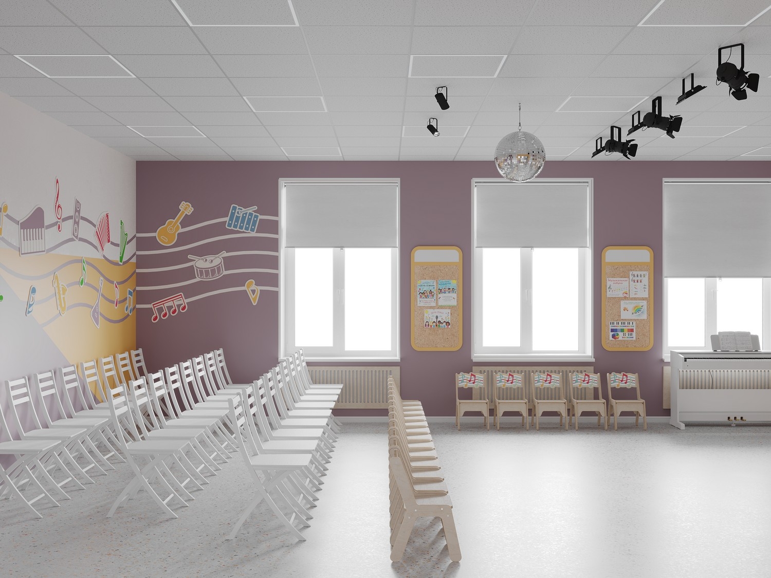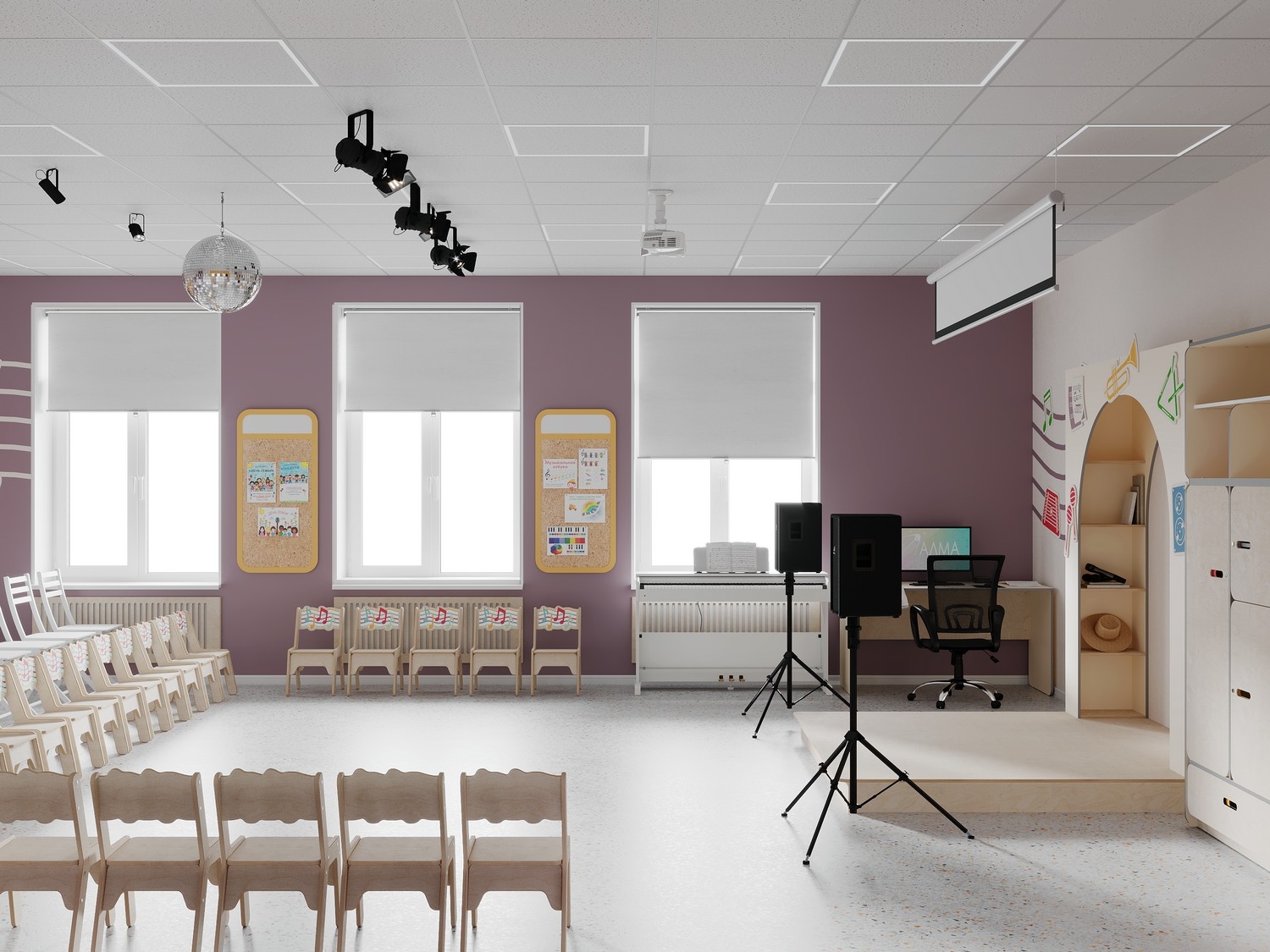 В комплектации готового музыкального зала есть техническое оснащение и базовый набор аксессуаров, костюмов и декораций для проведения тематических праздников и утренников. В зрительной части зала удобно размещается 25 воспитанников и 25 взрослых.