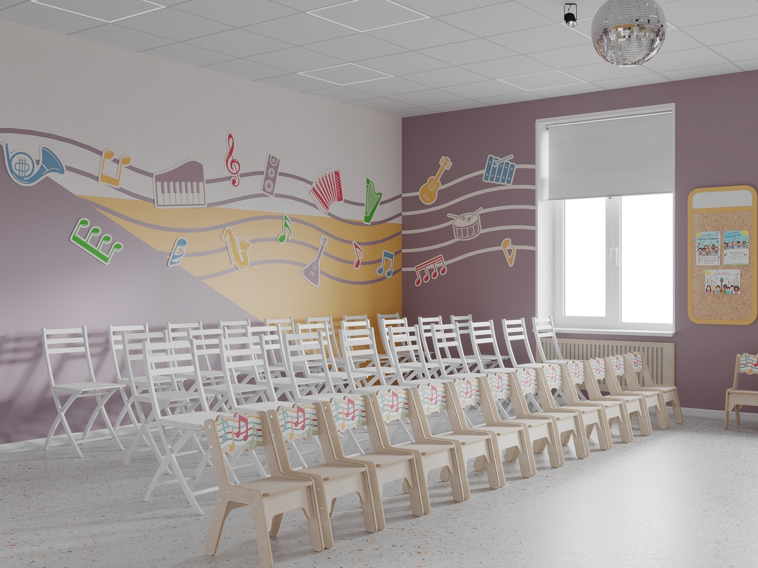 Наполнение готового музыкального зала тщательно продумано методистами и соответствует требованиям ФГОС ДО, СанПиН и правилам пожарной безопасности. Мы собрали все необходимое для эффективной работы педагогов и комфортных, продуктивных занятий по музыке и танцам для детей.