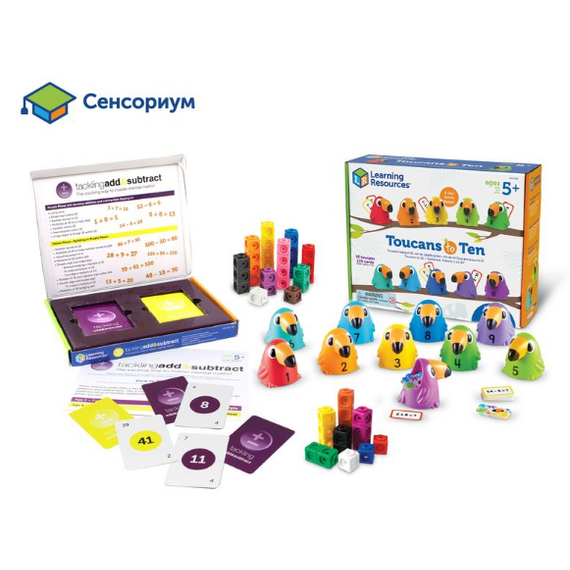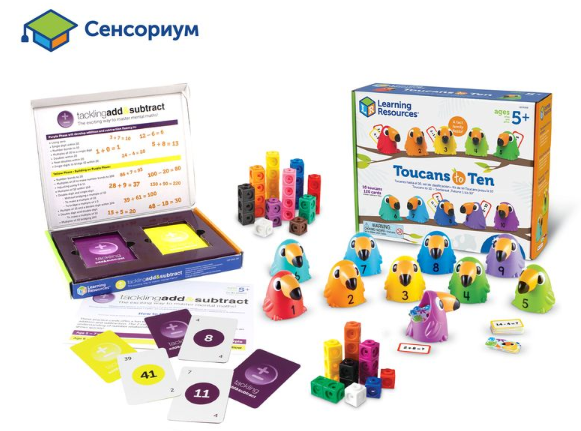Соединяющиеся кубики «Математические связи» — уникальный конструктор, который помогает наглядно понять принцип числовых операций: сложение, вычитание, умножение, деление, дроби, симметрия и другие. С помощью кубиков можно моделировать примеры или строить объёмные геометрические фигуры. «Считаем с туканами» — игра на скорость и внимательность. Нужно вытащить карточку с примером, решить его и быстрее других спрятать ответ в «пёрышках» птицы с подходящей цифрой. В наборе 10 пронумерованных туканов и 120 карточек. Материалы разработаны с учётом возрастных особенностей дошкольников и соответствуют требованиям ФГОС ДО, СанПиН и ГОСТ.