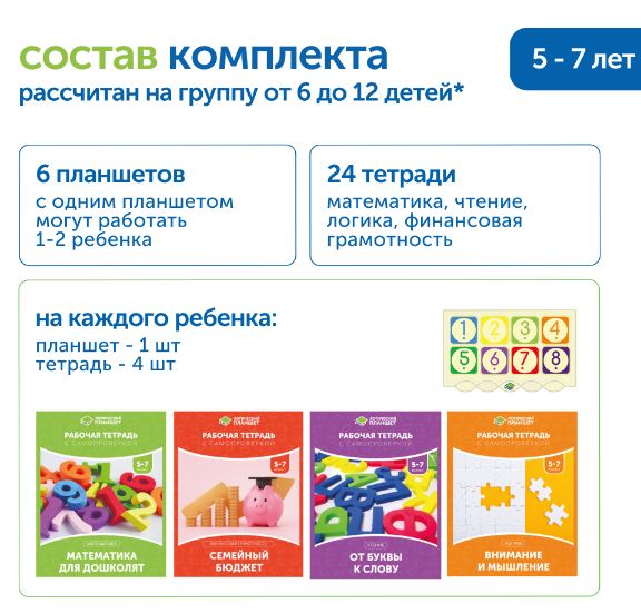 В комлекте: логический планшет – 6 шт/ 12 шт (в зависимости от комплектации), рабочие тетради по математике, чтению, финансовой грамотности, логике – по 6 шт/ 12 шт каждого вида (в зависимости от комплектации), контейнер для хранения с крышкой.