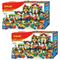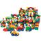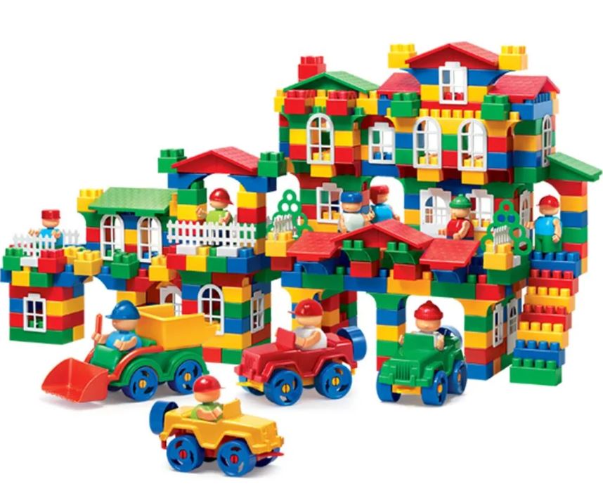 В комплекте: кубики различного размера, фигурки человечков, инструменты, сборные машинки, элементы декора (заборы, деревья, окна, двери, крыши).