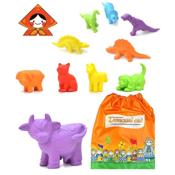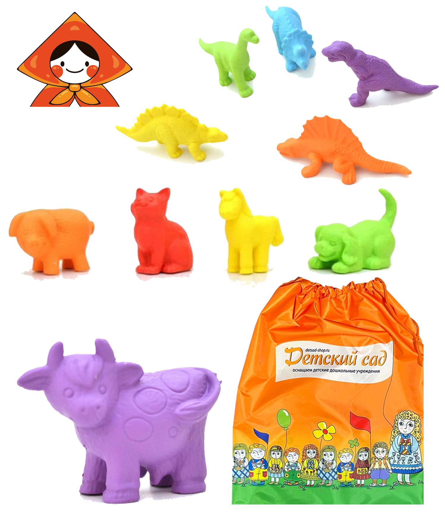 Игрушки мелкие - комплект. Материал - резина. Фигурки цветные. Всего 10 шт. Состав: ТЭП Тип упаковки: блистер Размер шт. в упаковке (Д*Ш*В) 98х10х124 мм - 2 шт. динозаркики и домашние животные всех по 5 шт.+ фирменная удобная упаковка для хранения - оранжевый мешочек с завязками и надписью "Детский сад".