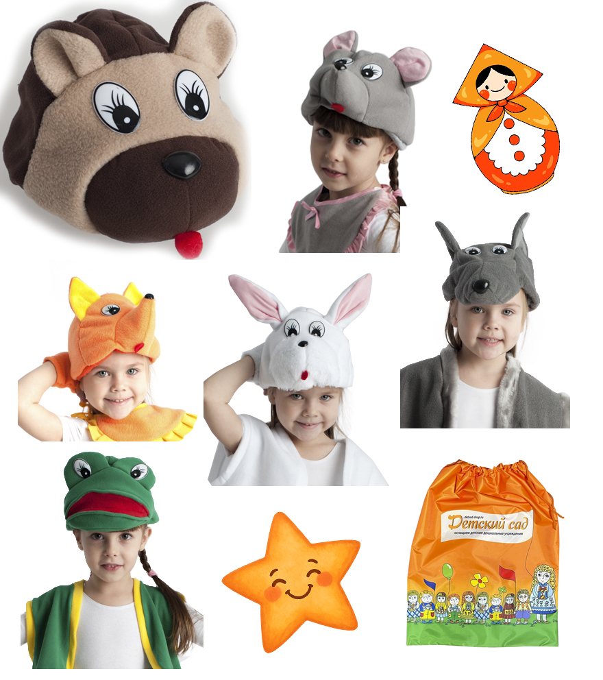 Состав: шапки детские - Мышка, Лягушка, Заяц, Лиса, Волк, Медведь. Итого: 6 персонажей-животных. Фирменная упаковка размером 50х40 см - мешочек для хранения - оранжевого цвета с надписью "Детский сад" с завязками.