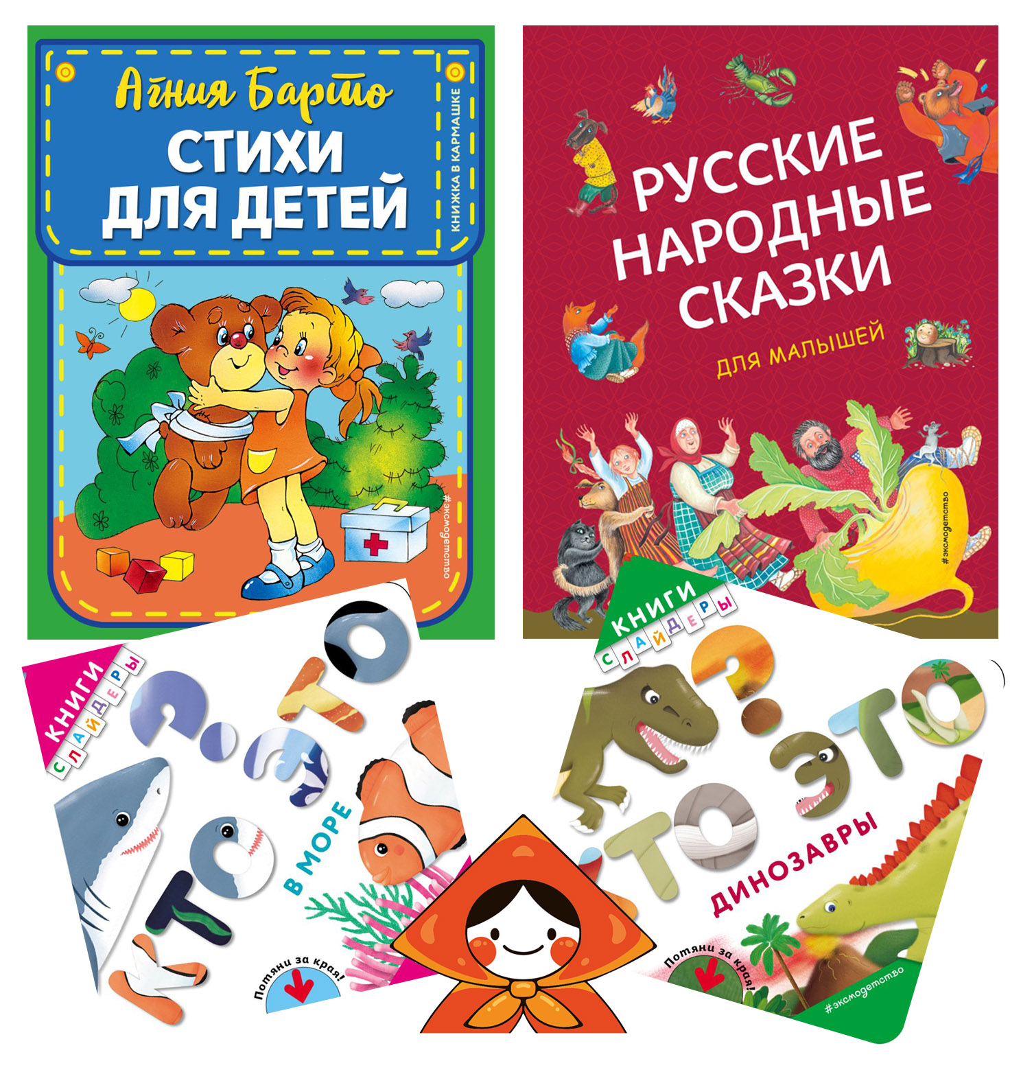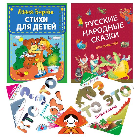 В составе: Стихи для детей. А. Барто, Книга КТО ЭТО? В МОРЕ, Книга КТО ЭТО? ДИНОЗАВРЫ, Книга РУССКИЕ НАРОДНЫЕ СКАЗКИ ДЛЯ МАЛЫШЕЙ.