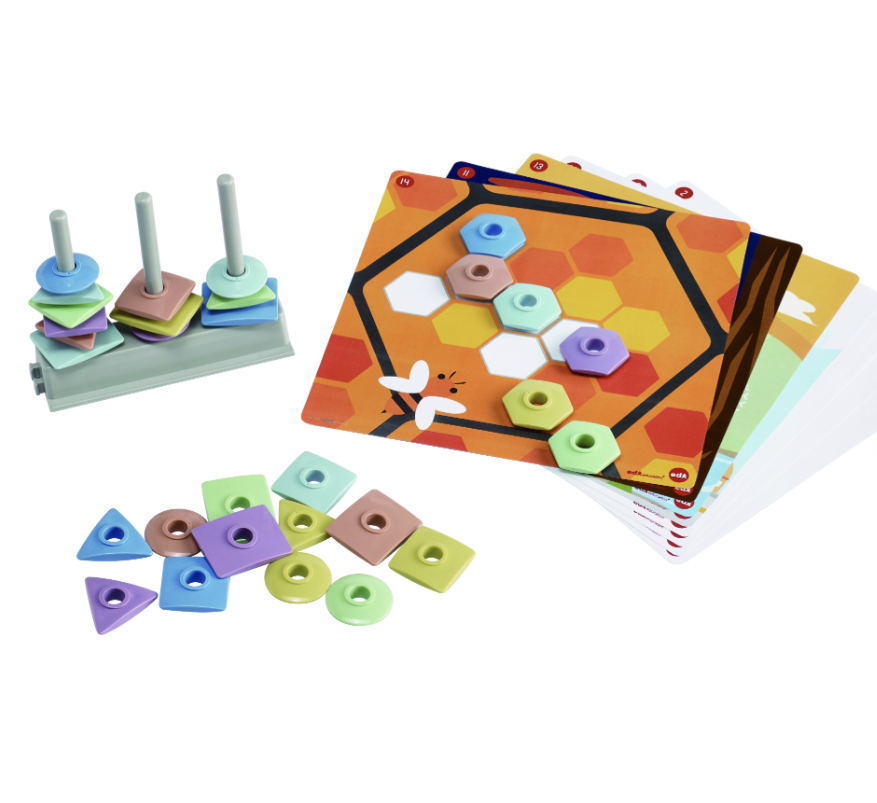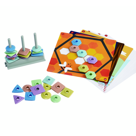 В набор входят: 30 фигур, 1 подставка, 3 стержня, 8 (2-х сторонних) карточек с заданиями. Размер: 1 подставка со стержнями 13 х 4,2 х 11 см.