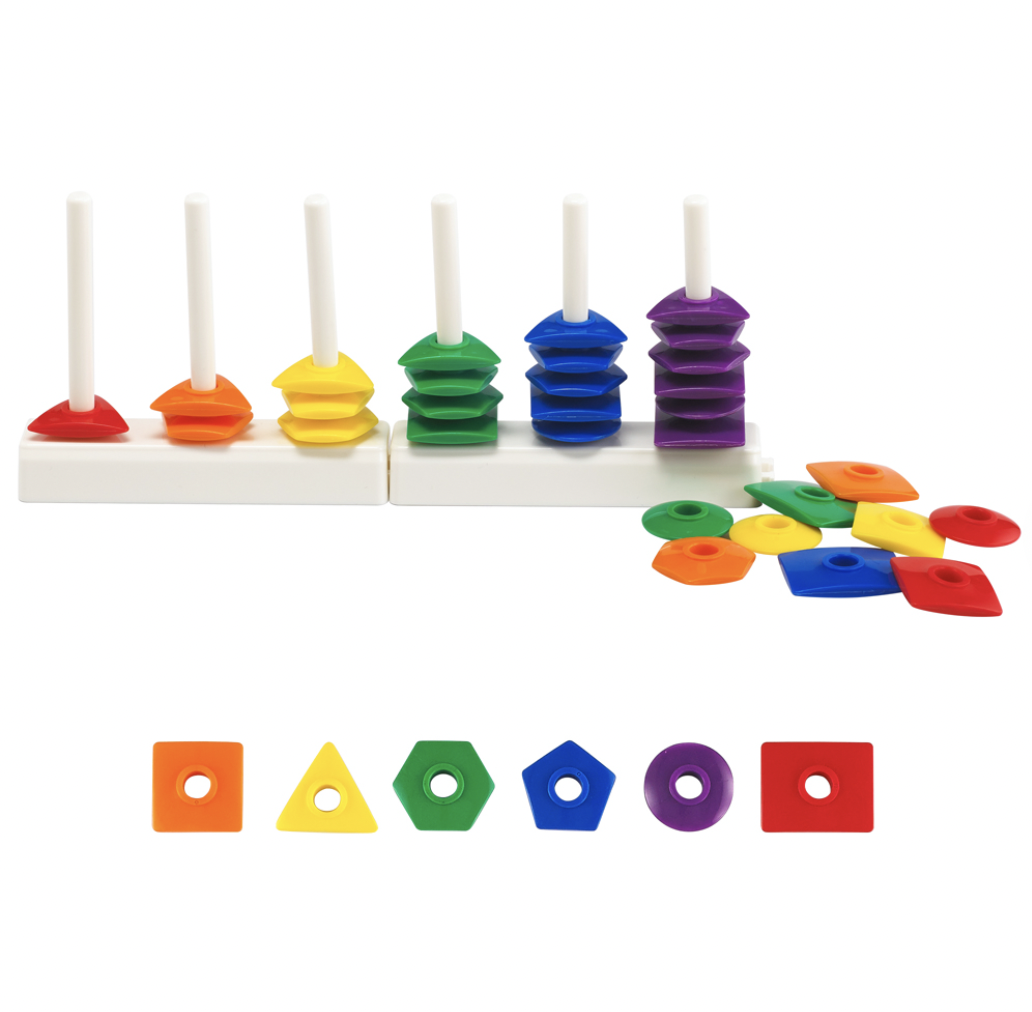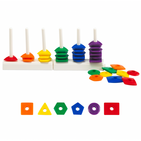 В наборе: - 36 деталей 6 геометрических фигур (треугольник, круг, прямоугольник, квадрат, пятиугольник, шестиугольник) в 6-ти цветах; каждая деталь по центру имеет отверстие для нанизывания; - 2 соединяющиеся между собой подставки, имеющие по 3 стержня для нанизывания деталей; - 10 двусторонних карточек с заданиями. Набор упакован в картонную коробку размером 23 х 23 х 5 см.