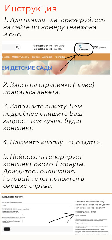 Вас приветствует нейропомощник воспитателя «Аксайт». С помощью этого сервиса вы можете создать уникальный конспект занятия для детей дошкольного возраста. Просто заполните нужные поля и нажмите кнопку «Подобрать». Через некоторое время в поле ниже появится готовый текст конспекта, полностью адаптированный под ваш запрос.