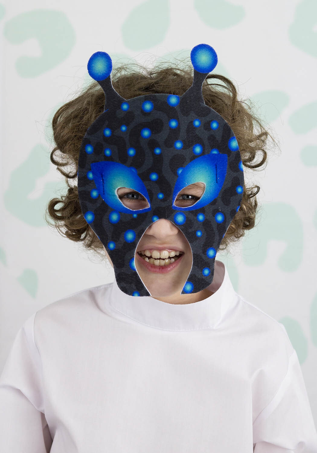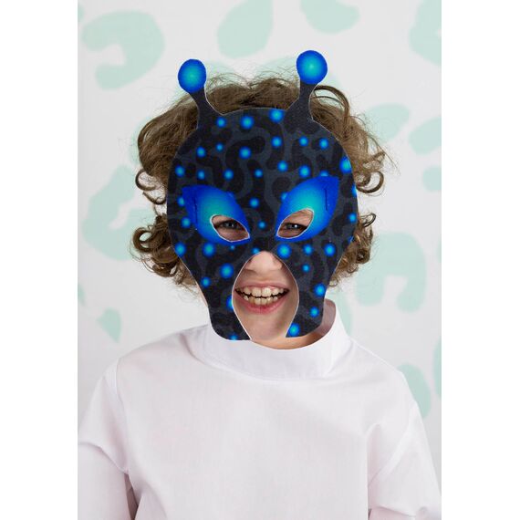 Детская карнавальная маска Инопланетянина из фетра на резинке универсального размера для девочки или мальчика от 3-х лет. Эластичная мягкая резинка шириной 2 см. крепко пришита с изнаночной стороны, комфортно садится, не мешает и не тянет. Гипоаллергенный фетр толщиной 3 мм. плотный и приятный на ощупь. Такой нетканый материал войлочного типа отлично держит форму и не мнется, не имеет постороннего запаха.