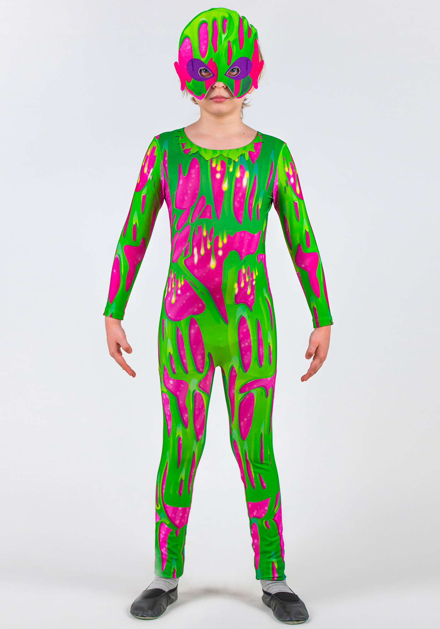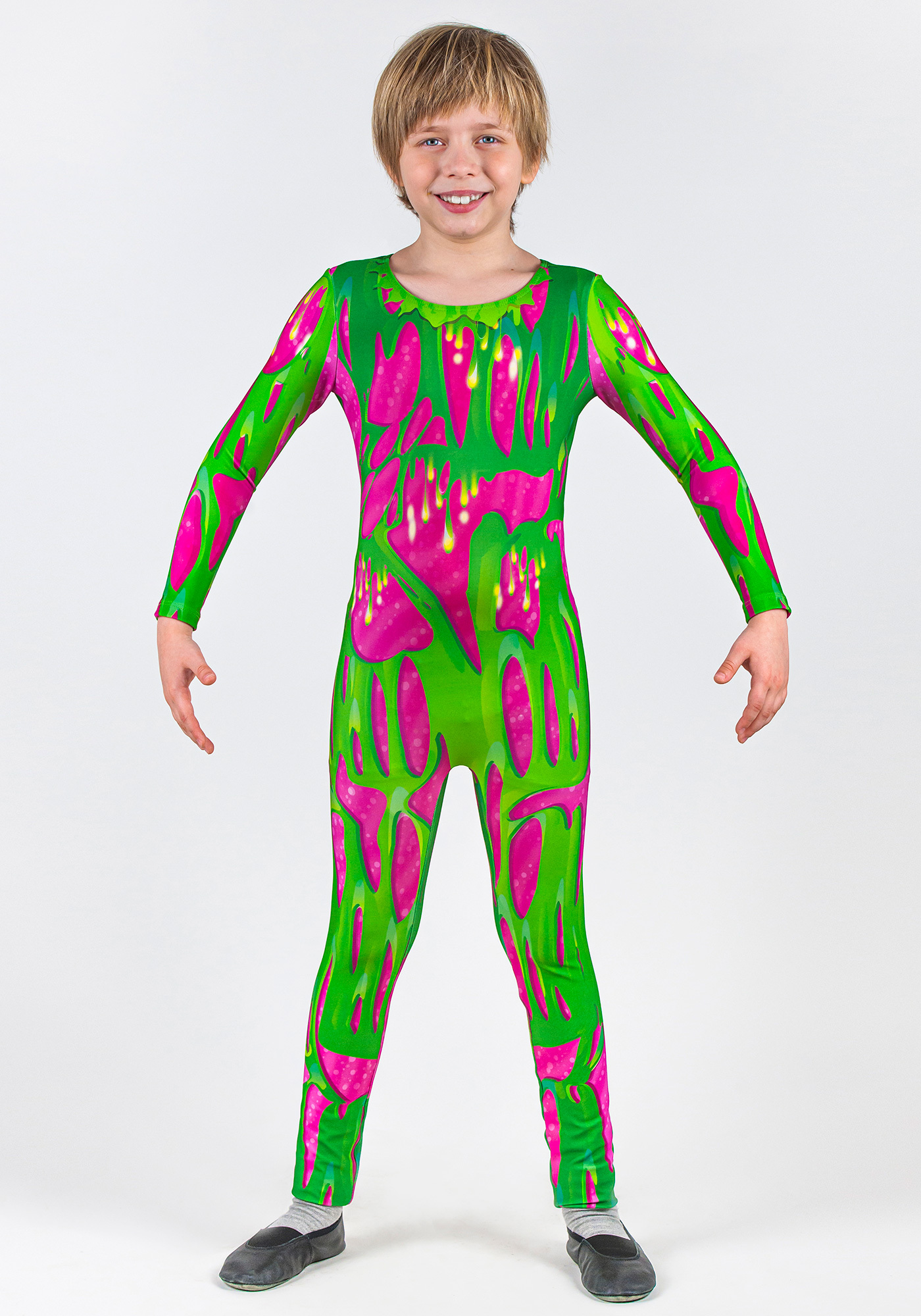 Комбинезон Инопланетянина для детей - это гимнастический комбинезон с ярким рисунком, изготавливается на выбор в 2-х вариантах: цвет зеленый/розовый и цвет черный/синий. Принтованный рисунок нанесен на ткань при помощи сублимационной печати с использованием гипоаллергенной краски. Рисунок сохраняет яркость даже после 100 стирок и не выгорает.