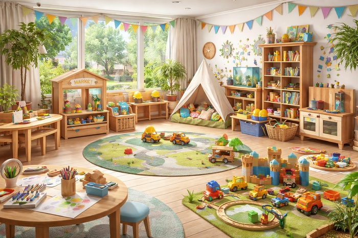 Если говорить просто, как обустроить игровую среду в детском саду — значит не заполнить комнату игрушками, а создать условия, в которых ребёнок будет активно развиваться через игру.