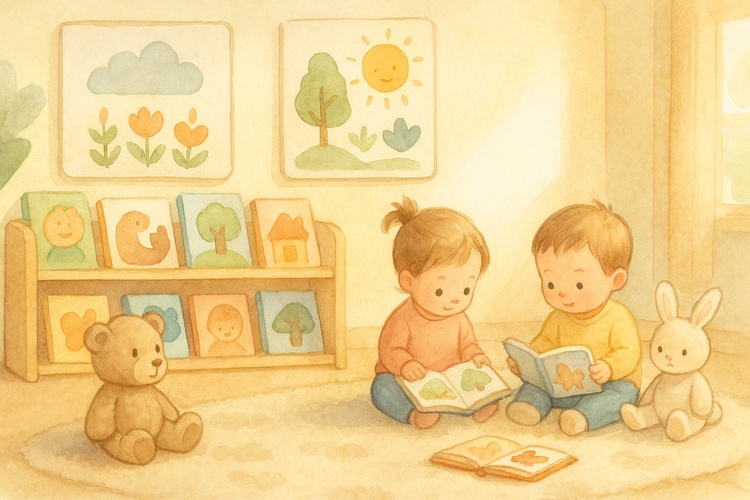 Расположить книги обложками к ребёнку; держать 12–15 книг в открытом доступе, остальное — в ротации раз в 2–3 недели. На полке — разделители-пиктограммы: «Сказки», «Стихи», «Про животных», «Про детский сад». Рядом — 2–3 мини-наборы карточек с героями для пересказа, закладки с пиктограммами чувств («рад», «удивлён», «сердит»).